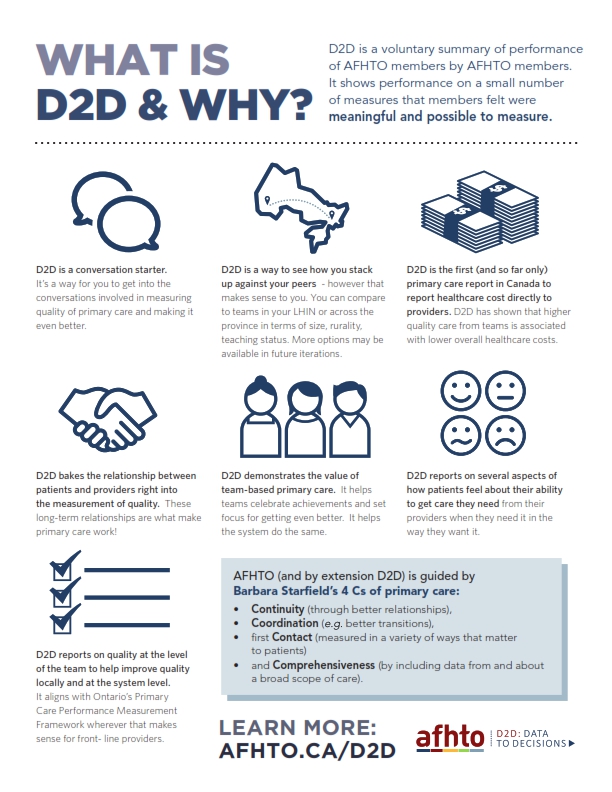 Data to Decisions (D2D) is AFHTO’s renewed approach to performance measurement in primary care.